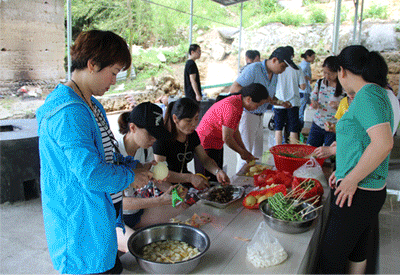因为事先已经分好组,到达目的地后,大家开始自觉地准备食物,洗菜的、削水果的、煮米粉的、串肉的,忙的不亦乐乎,每个人脸上都带着笑容,人多力量大,瞬间就把该准备的东西都备好了,那么就开始烧烤吧。